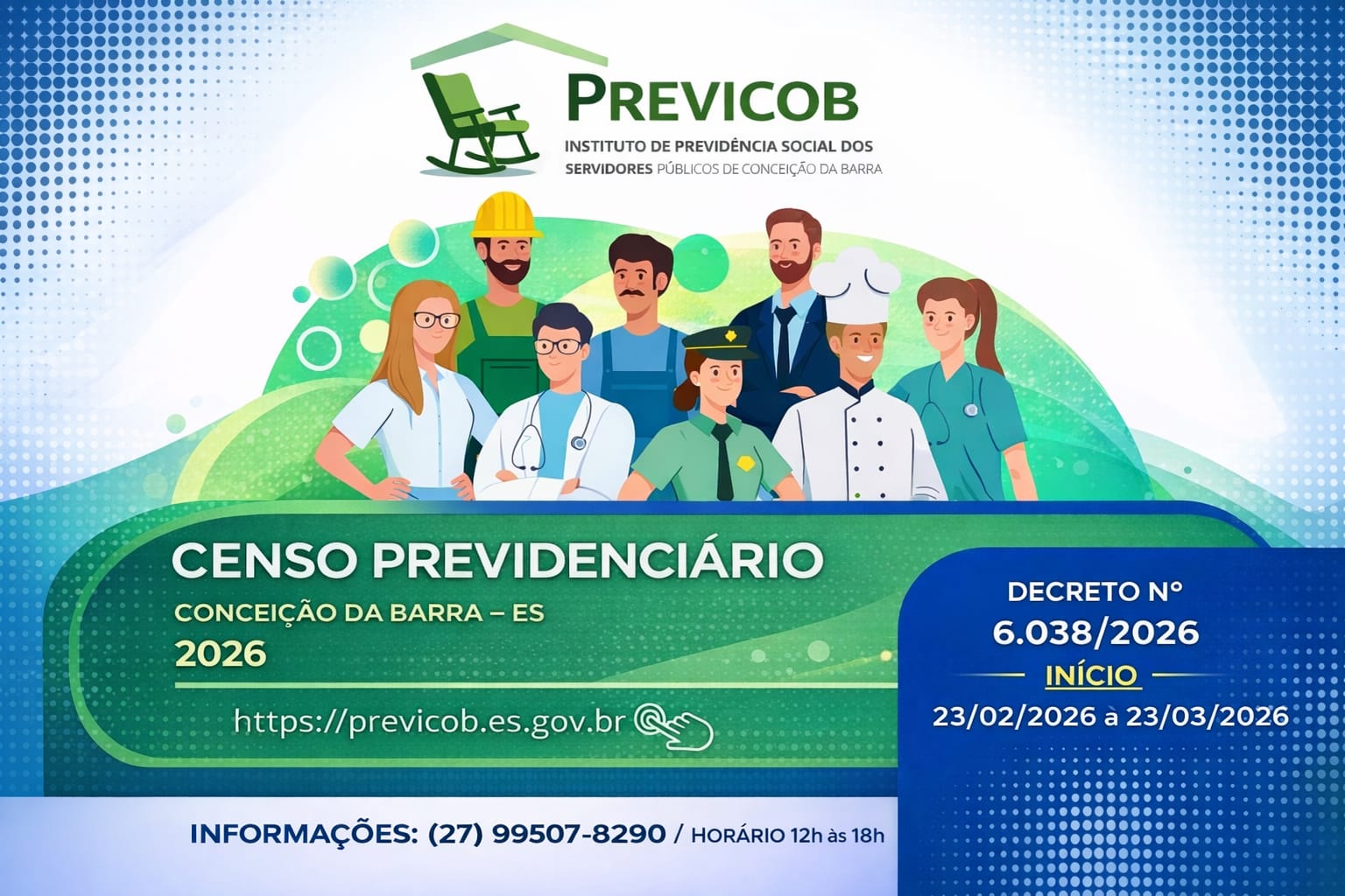 CENSO – 2026 O Instituto de Previdência Social (Previcob) vai realizar um Censo Previdenciário para o qual estão convocados os servidores públicos efetivos ativos da Prefeitura Municipal de Conceição da Barra, Câmara Municipal, Aposentados e Pensionistas do Previcob. O Censo acontece 23 de fevereiro 2026 a 23 de...